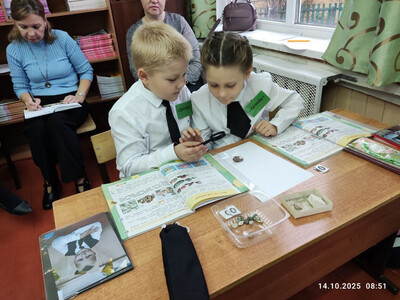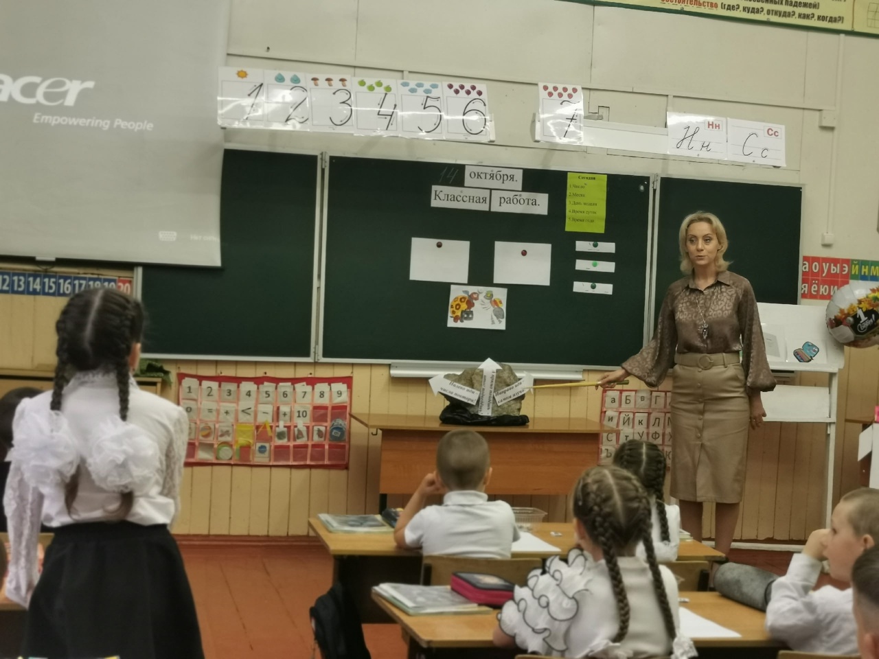 Учитель 1 класса Соколова Лариса Викторовна провела комбинированный урок окружающего мира/математики по теме "Что у нас под ногами?/ Числа от 1 до 10". В течение всего урока ребята выполняли практическую работу по изучению камней (гранита, кремня и известняка) и закрепляли знания чисел в пределах 10, используя камни в качестве счетного материала. Гости отметили четкую структуру урока, плавные переходы от одного этапа к другому, уместное использование наглядного материала, оригинальный подход для введения темы и подведения итога урока. Огромный камень со стрелками, коллекция камней для парной работы, использование лупы, карточек с числами для обратной связи, куб для рефлексии, парта отличника - это малая часть интересных находок учителя.