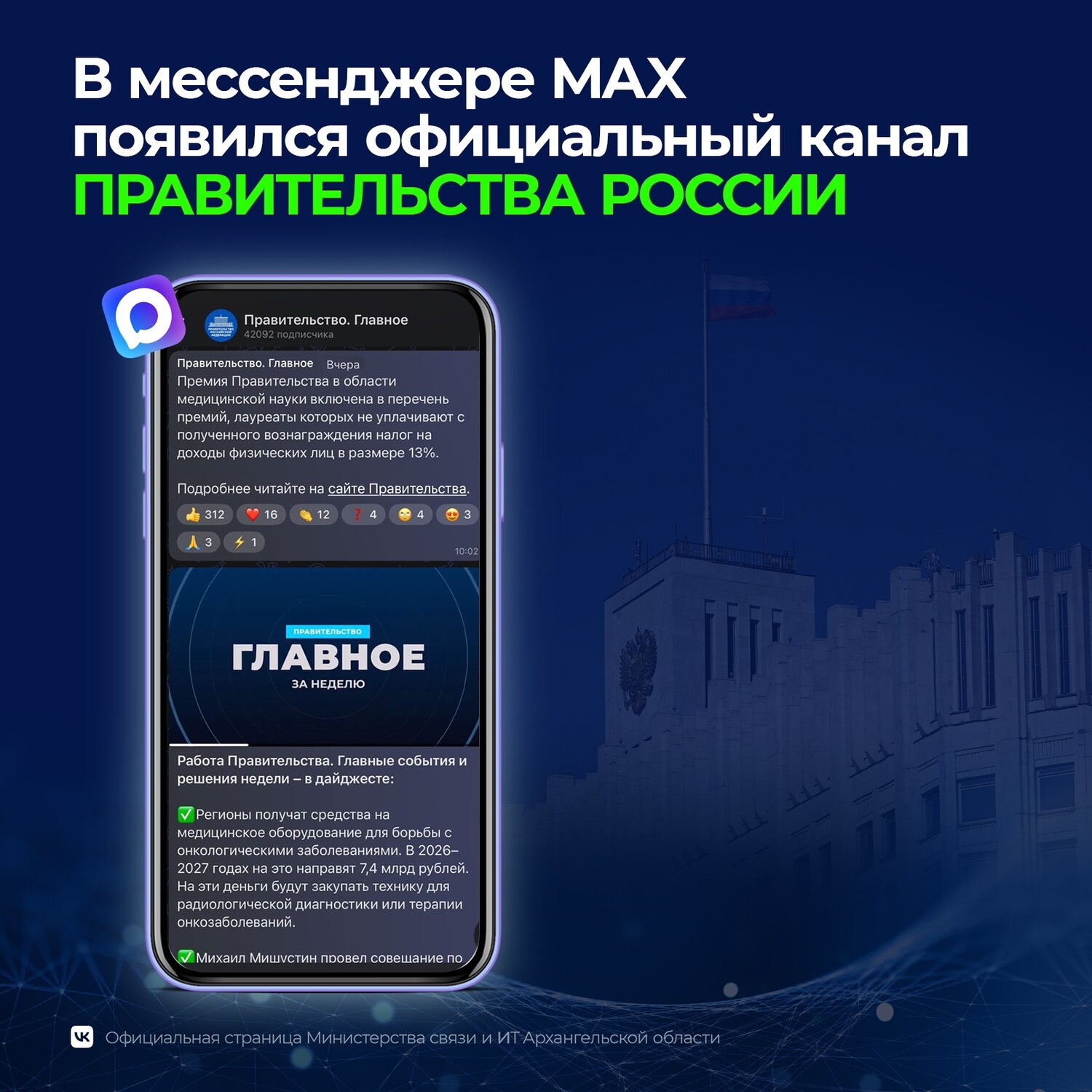 В мессенджере MAX создан официальный канал правительства РФ.Об этом 9 сентября сообщили в пресс-службе правительства.